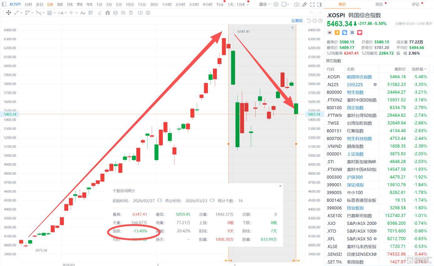 韩国综合指数一度暴跌超6%。自美伊以战事爆发以来,该指数从2月底的高点已经大幅回撤13%。