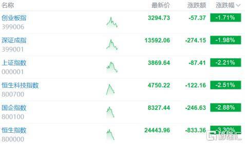 港A股市场紧跟走低。恒指大跌超3%,恒科指、国指跌超2%;沪指跌破3900点,深证成指、创业板指跌近2%,大金融、科技股集体下挫。